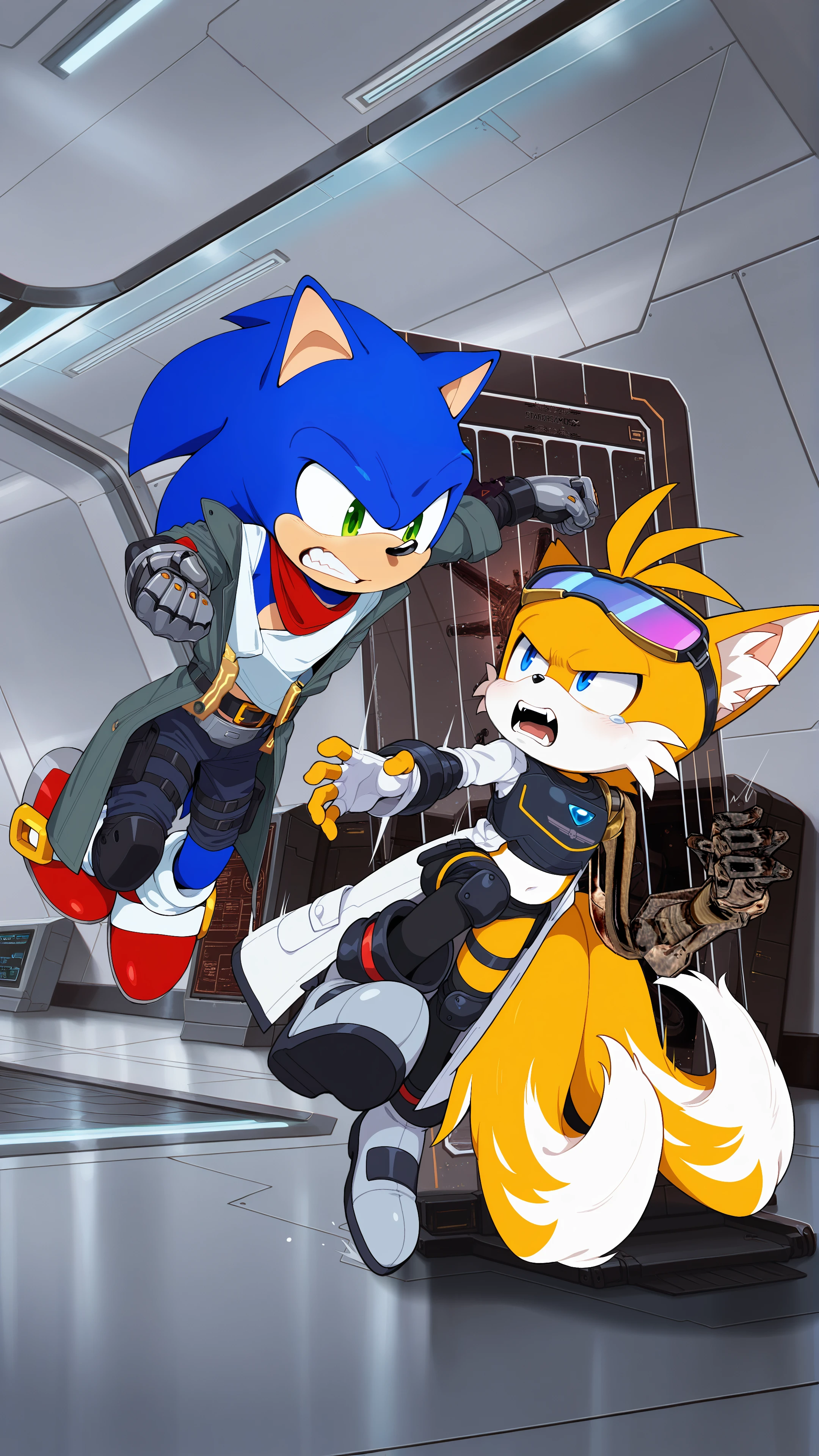 Sonic, already waiting outside, couldn't help but gripe, “Took you long enough, Tails.”