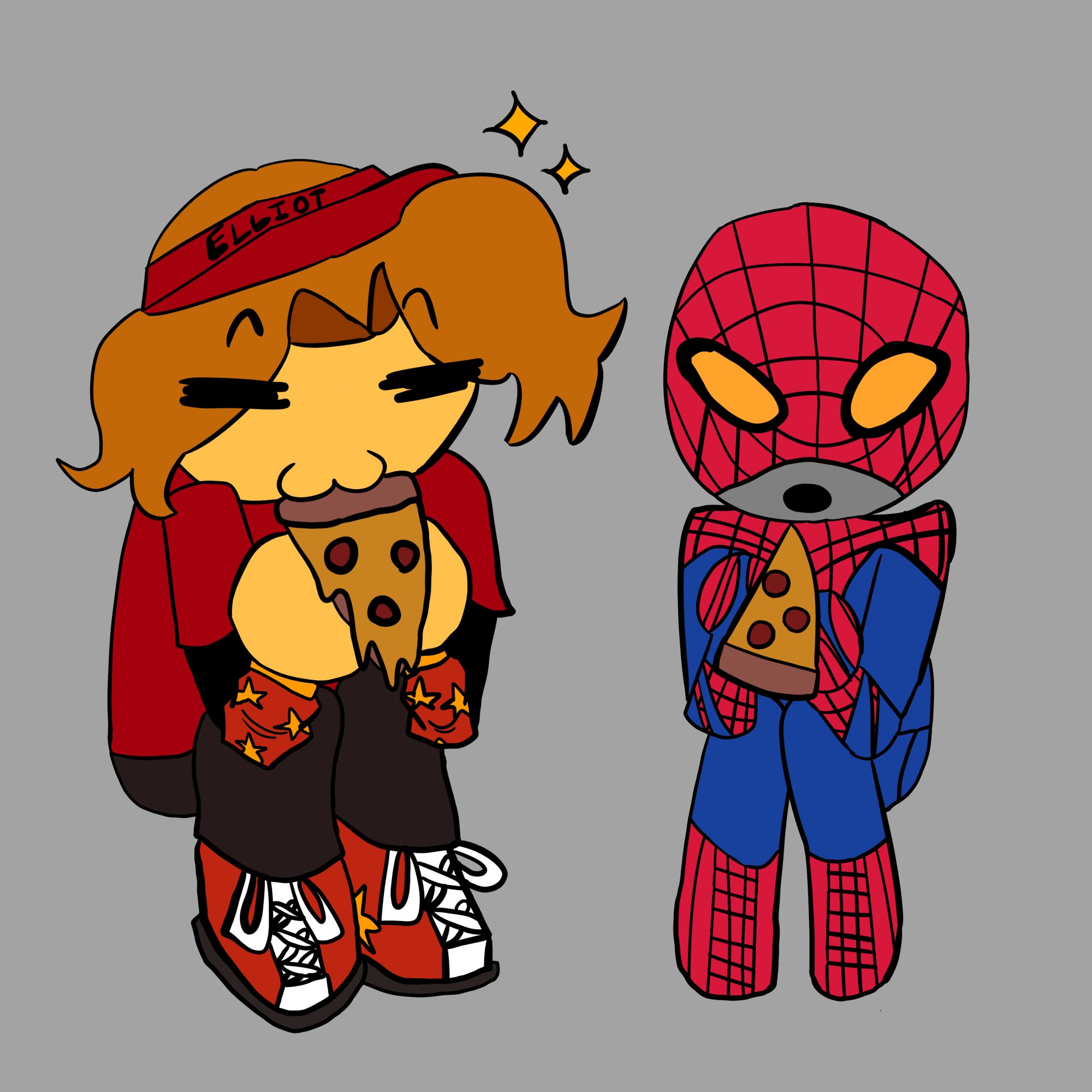 Foxguy: hey crow! its me! the guy who requested spider-bacon twice! i think im gonna return our mutual webhead eating pizze with elliot (mask only open to show his mouth, yes thats a thing he can do, he's gotta keep that secret identity!) in the tasm 1 suit, reply to me if you need details or want to change anything!