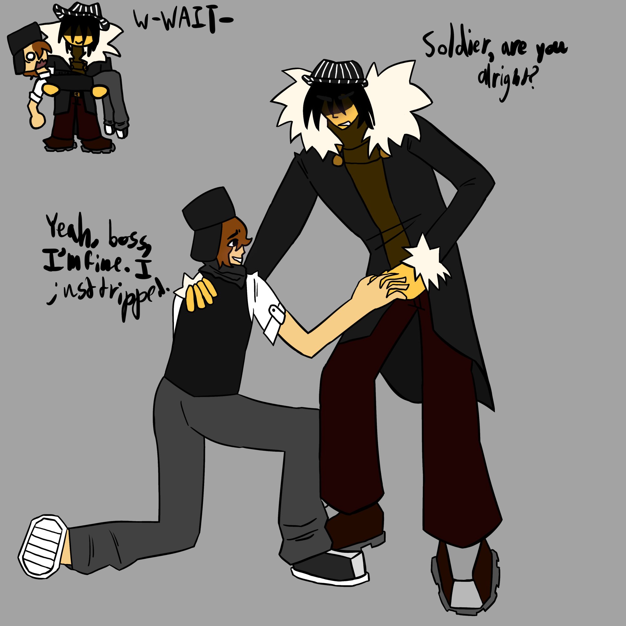 I lava retroslop (Guest): hello Mx.Golden Pheasant, i humbly request soldier, getting picked up by mafioso after he tripped, thank you kindly :D