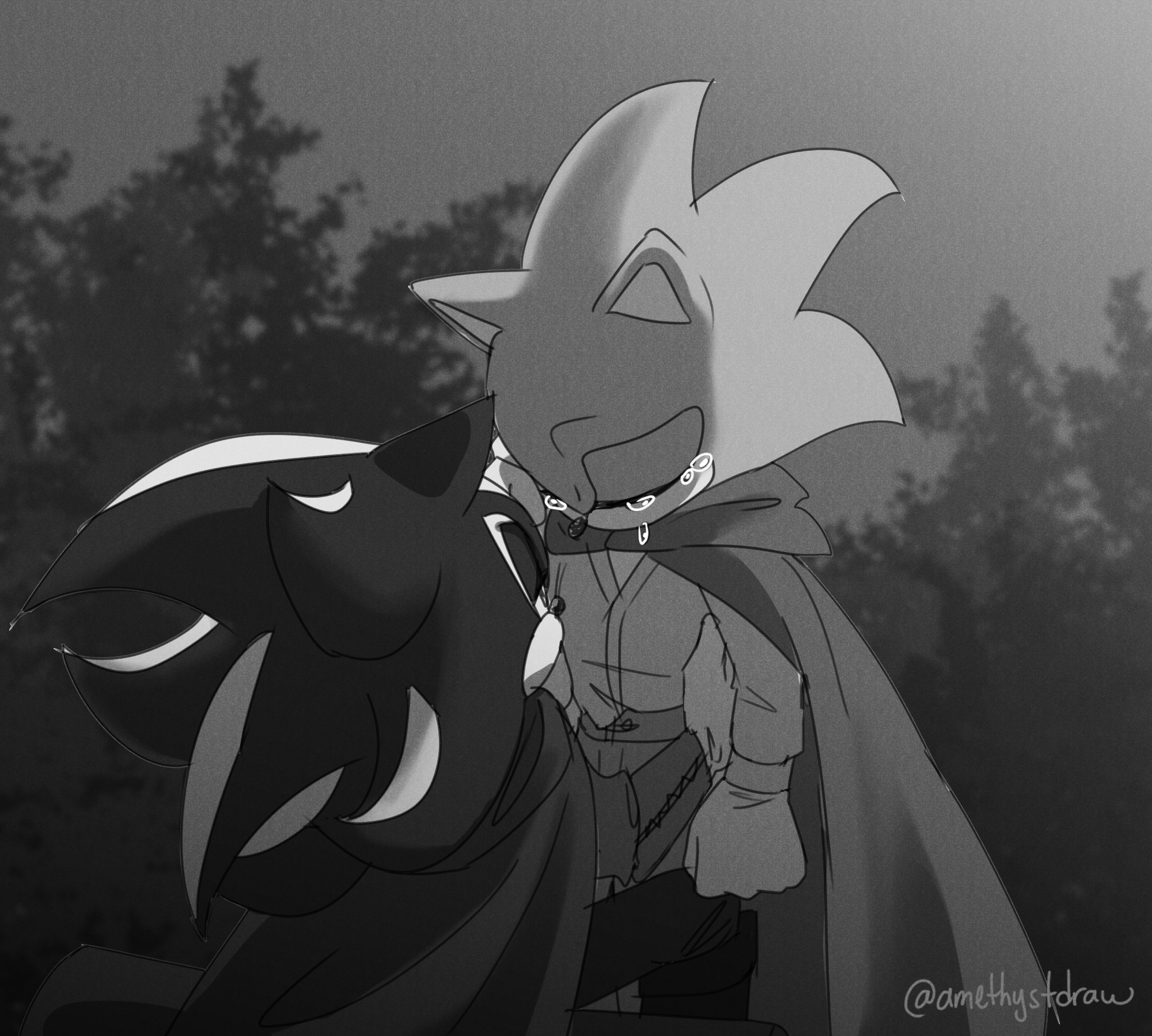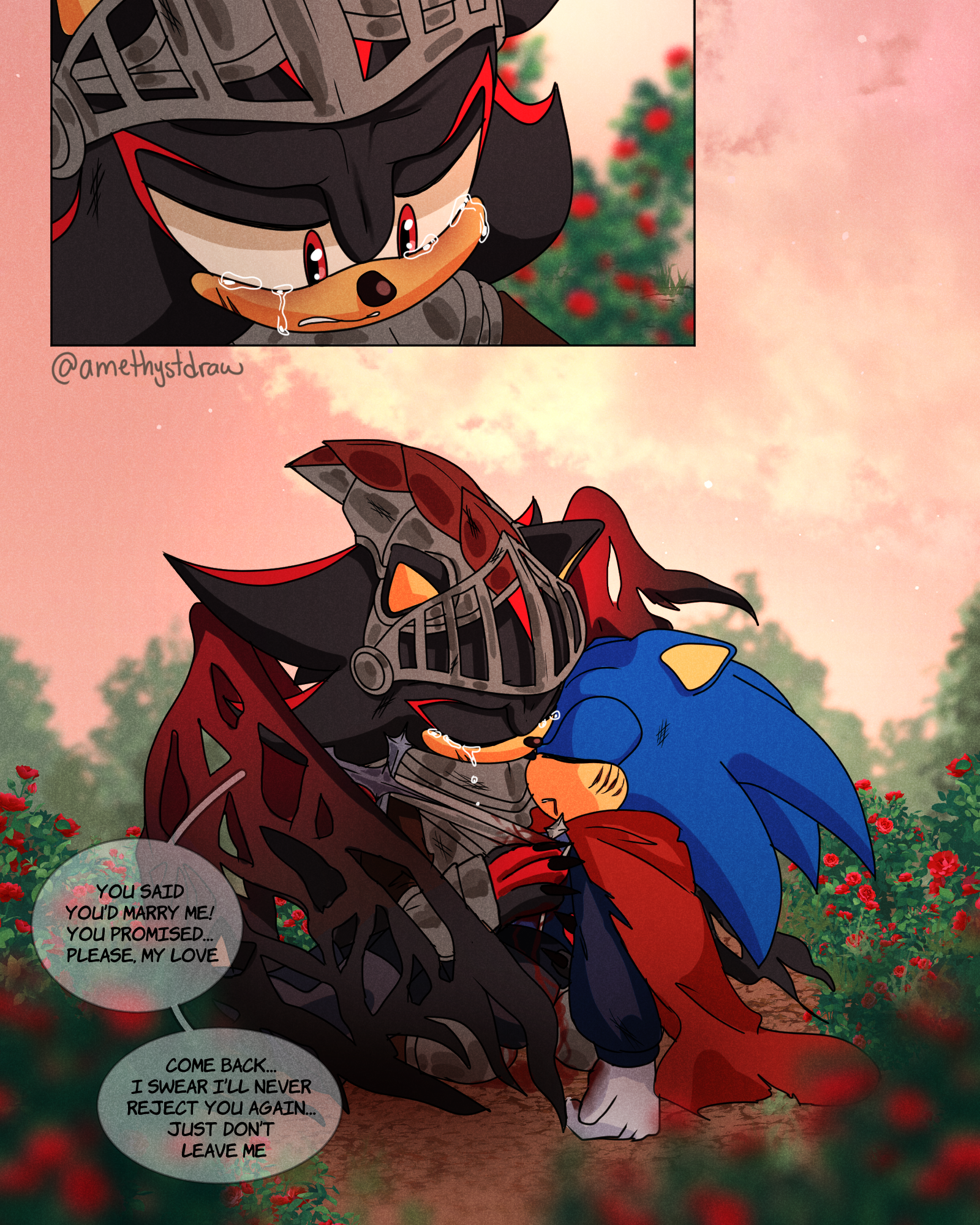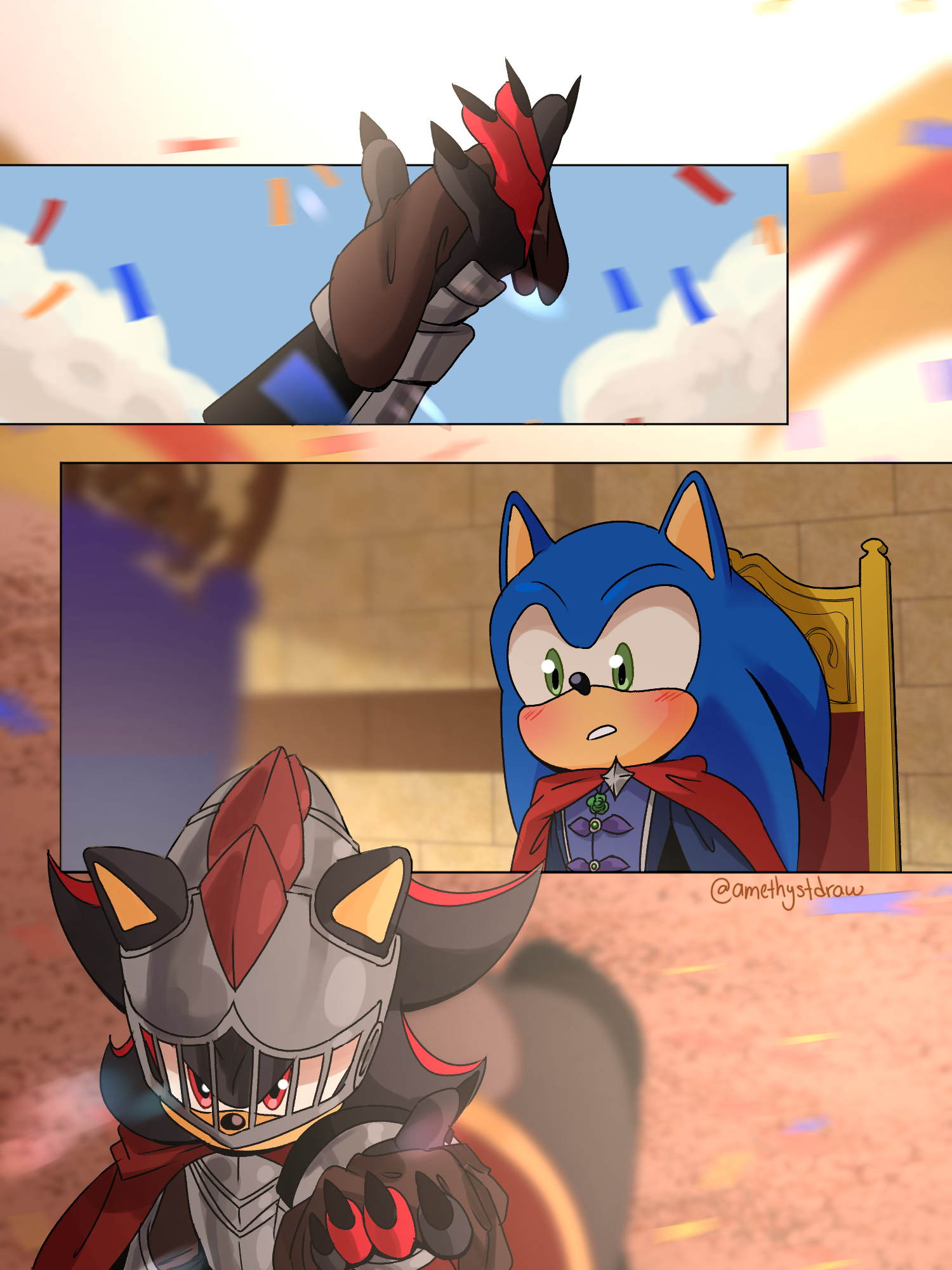 Sonic turned his eyes to him and the sight nearly stole his breath as much as the chair had. Draped in a cloak as dark as wine, he was another young hedgehog, his black quills streaked with crimson lines down his back and framing his fierce gaze. His eyes rivaled the palace rubies. He was everything out of one of his mother’s romance novels or maybe it was just the adrenaline, but Sonic found him stunning and mysterious.
