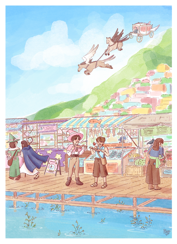 As they continue to walk, they spot a majestic flying carriage a few feet ahead of them. Two pegasi stand still while the coachman fastens their reins, securing them to the large white carriage. Although they’re a common form of transport, it's been a while since Hao last saw a flying carriage, let alone entered one of them, because he’s always in the town centre rather than the outskirts. The huge white wings on the sides of the carriage never fail to amaze him, especially knowing the amount of magic needed to enchant them in order to keep the carriage afloat.