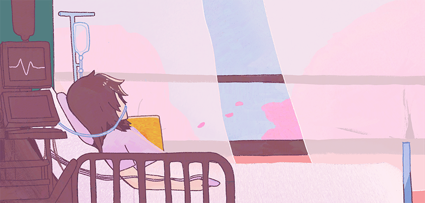 He looked to his open left palm lying beside him and saw the tiny pink petal of a cherry blossom within the cup of his hand, contrasting the unwelcome sight of tubes latched to his arm.