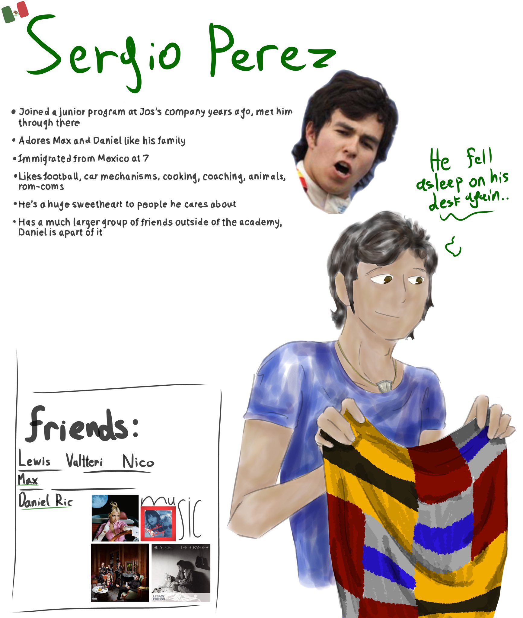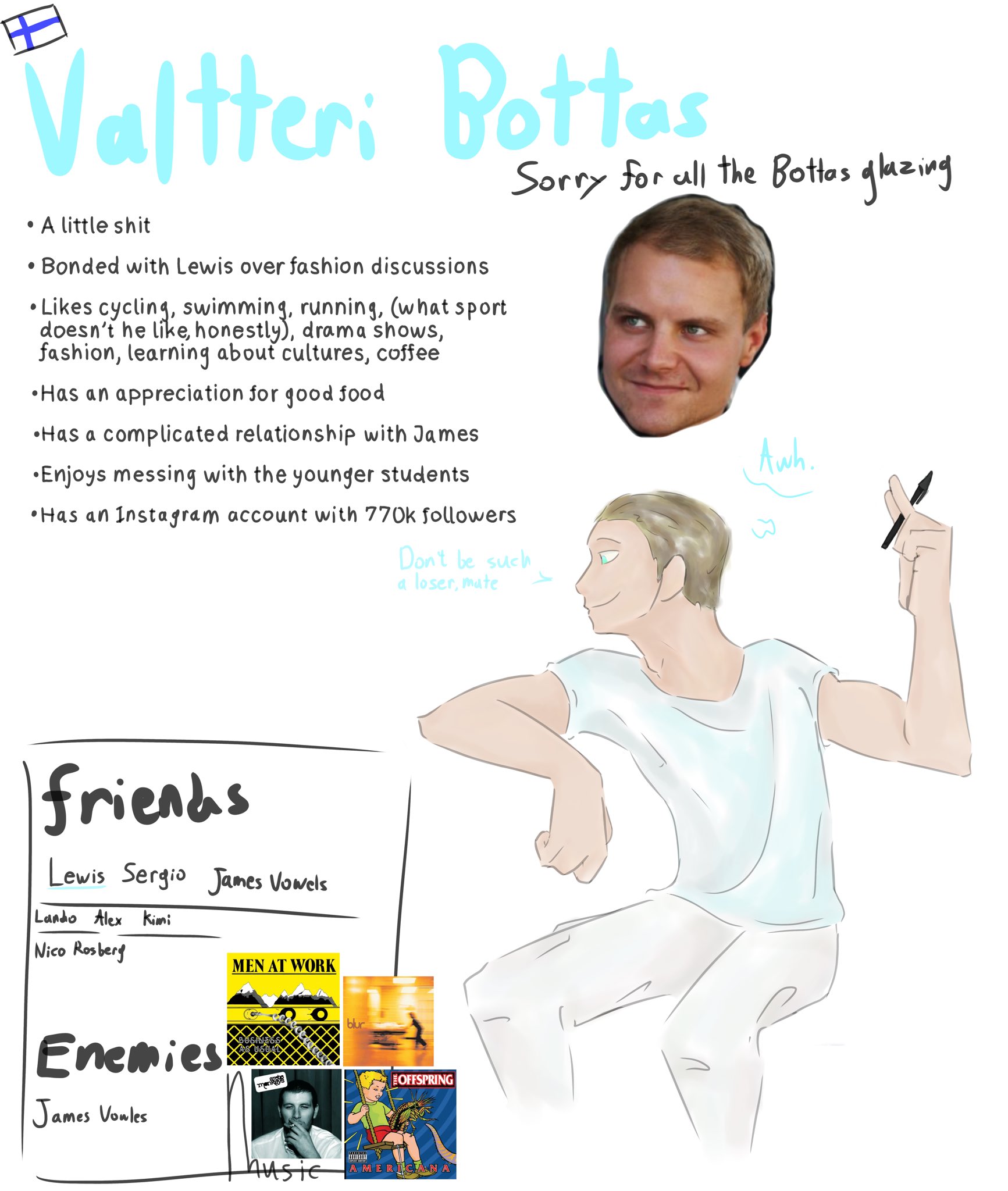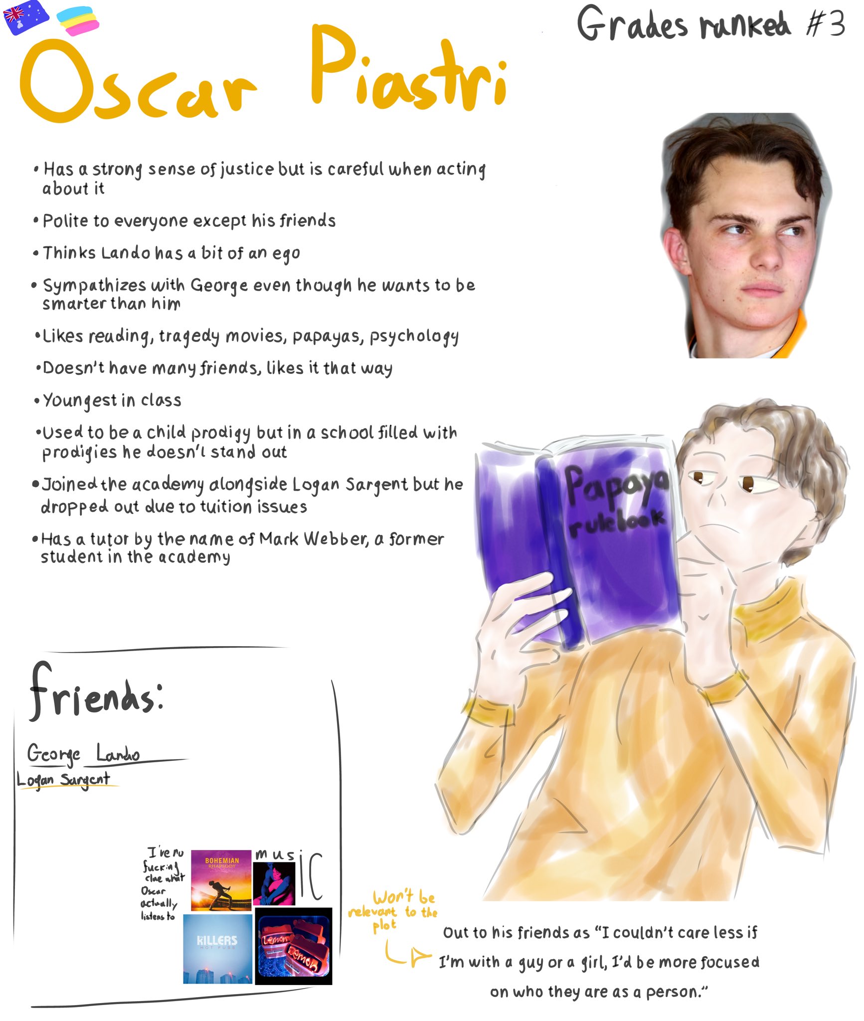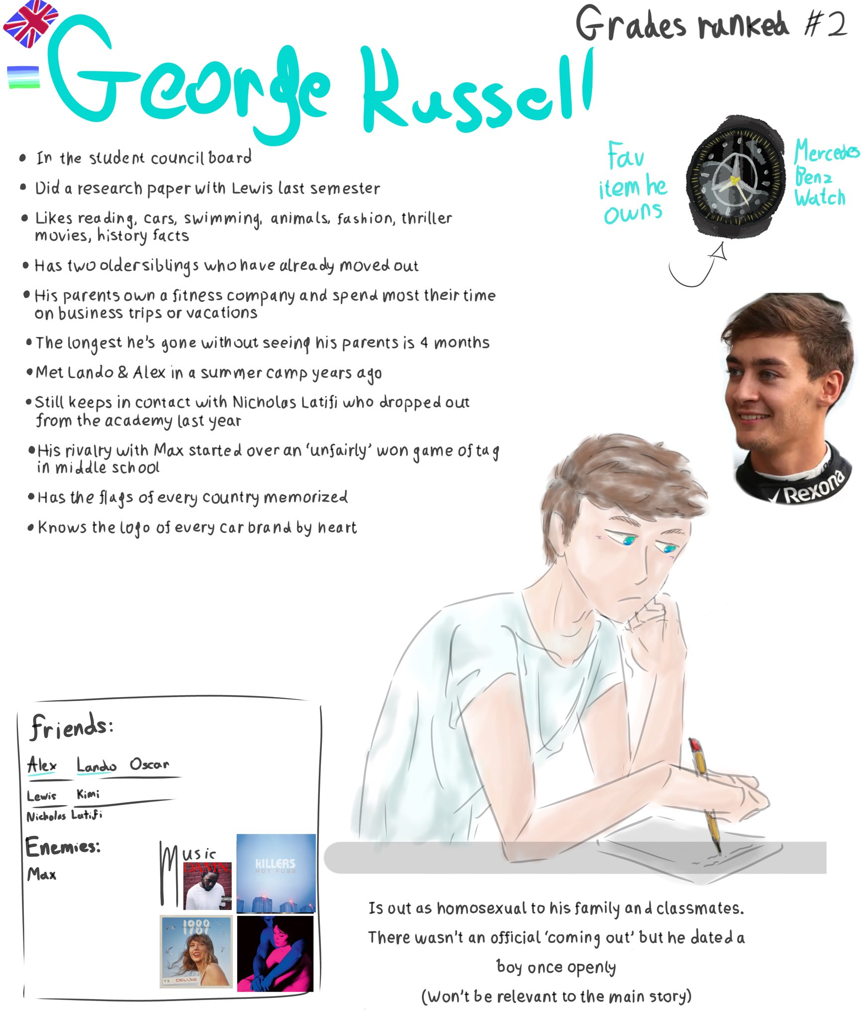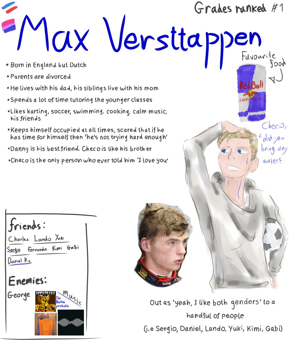 Here’s a thread of a few character pages I doodled - Most of it will not be relevant to the plot but I find these really fun to do. For those of you who don’t have Twitter, you can find the pages as individual images here: [1/5 - Max] [2/5 - George] [3/5 - Oscar] [4/5 - Sergio] [5/5 - Valtteri]