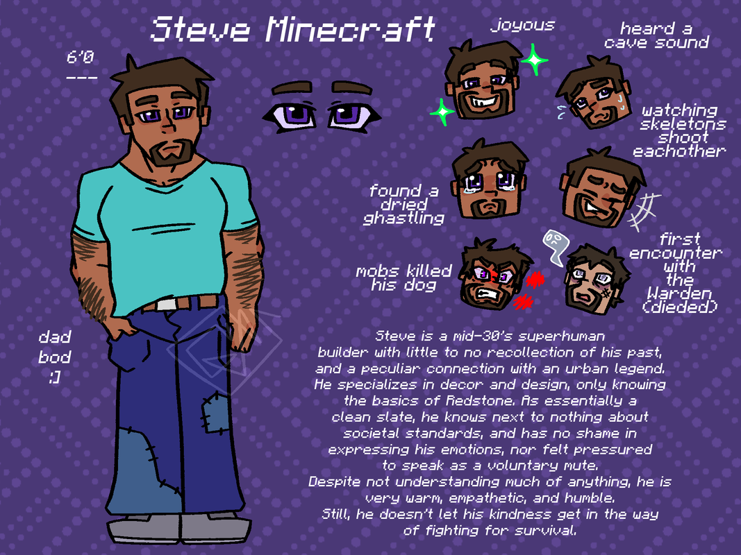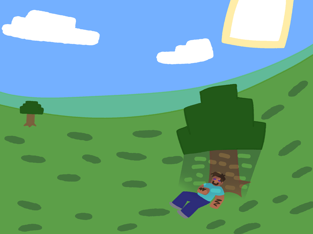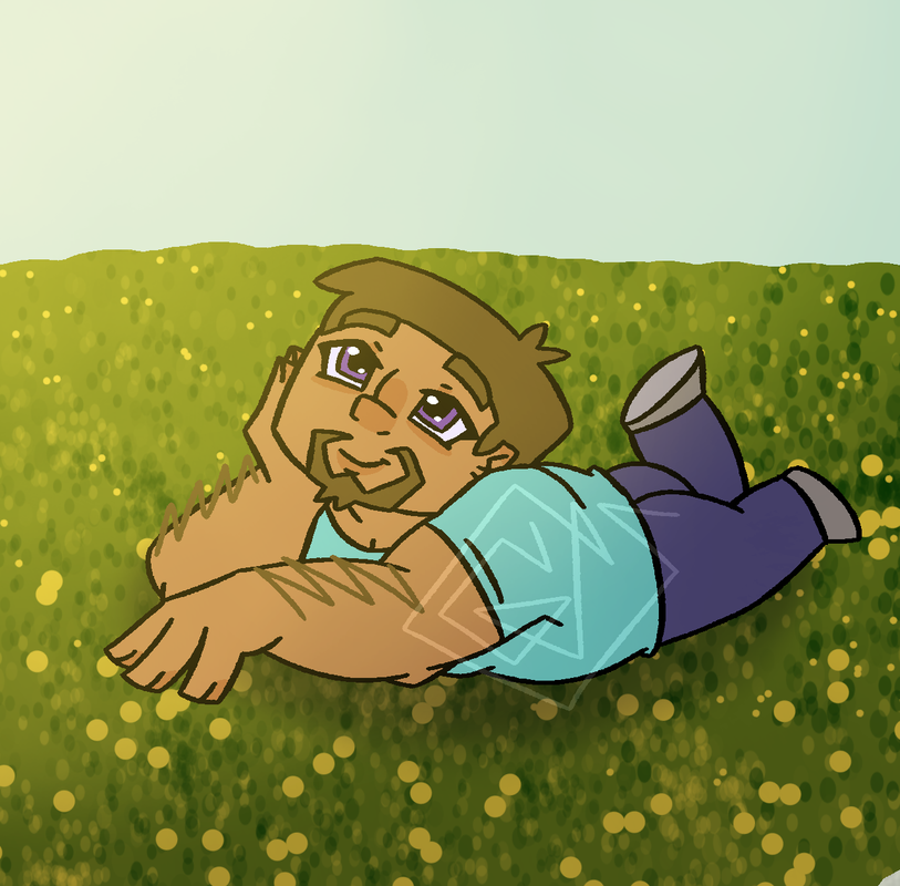 The opening credits start and list off a couple names, before the scene fades to a blue morning sky, overlooking the grassy plains of the Overworld. The plains are speckled with trees, mainly oak, and also a plethora of farm animals, from cows to sheep-- chickens to pigs. The camera then pans to a burly man laying underneath an oak tree, the man was 6 feet in height with tanned skin and dark brown hair + iconic beard (yes it is a beard, sorry smiley Steve believers), his clothing is mostly shades of blue apart from a brown belt lining his jeans, and his eyes soon open to be blue? Purple..? Blurple, to appease both parties.