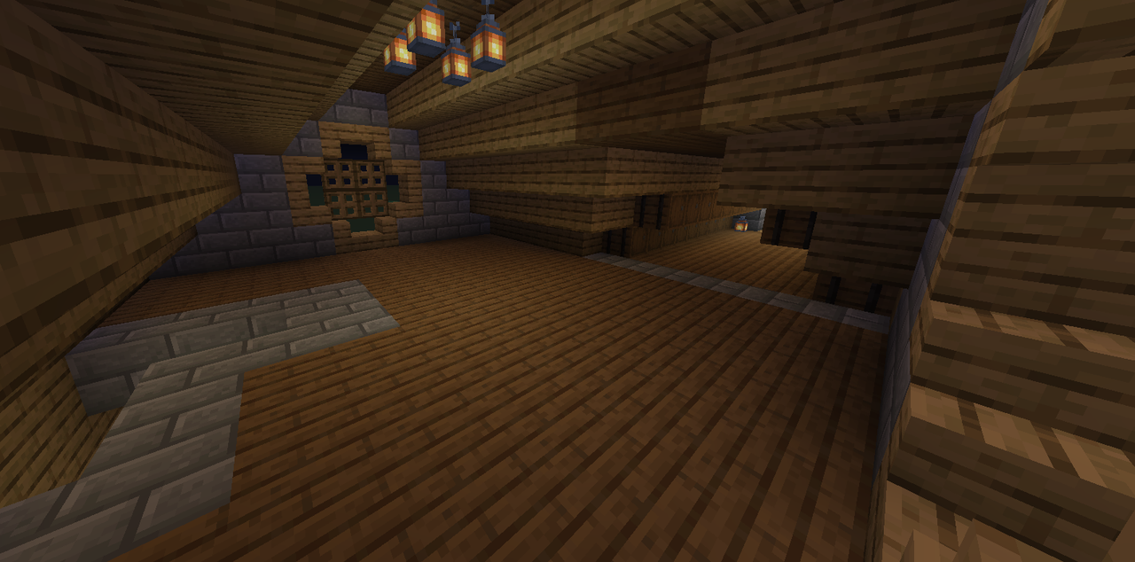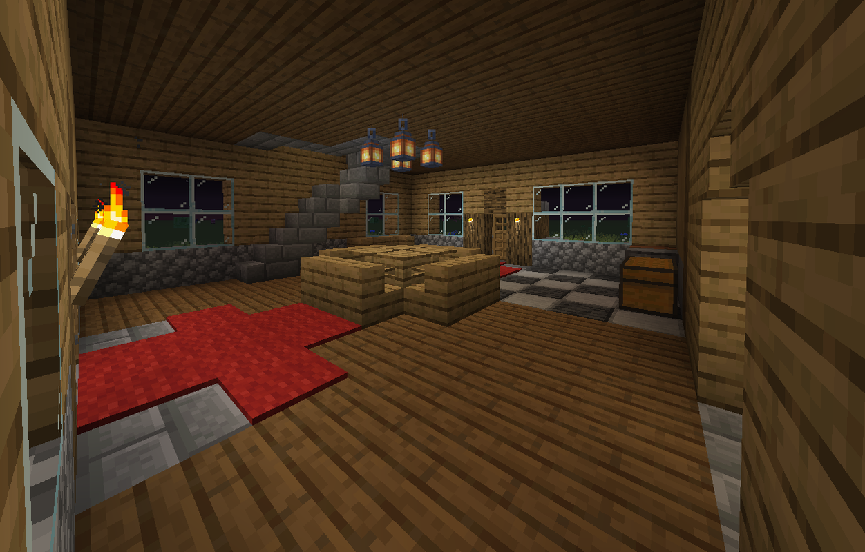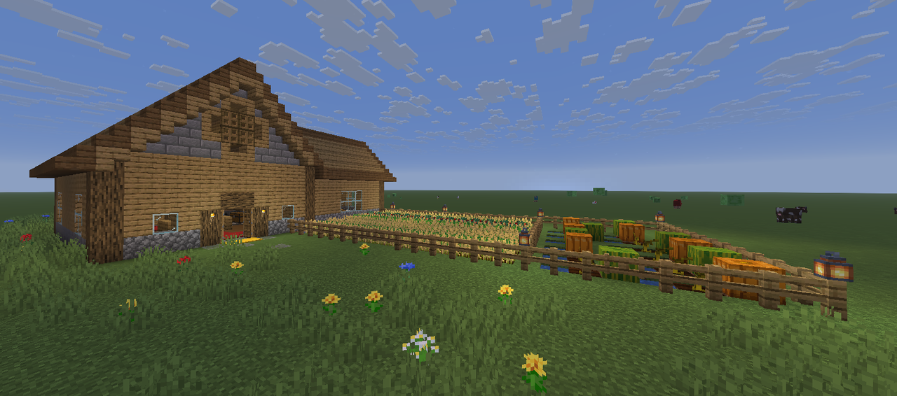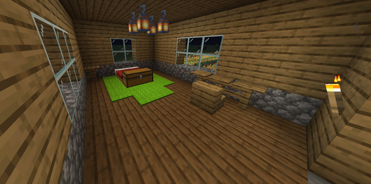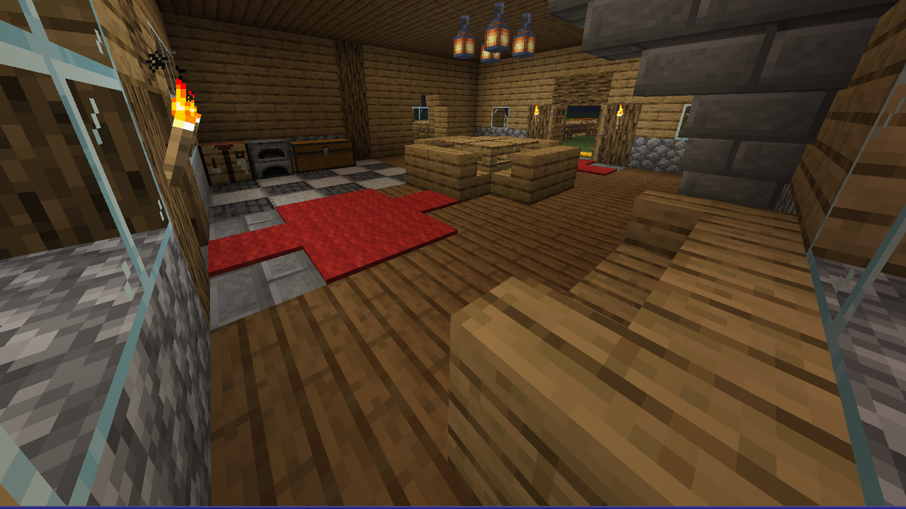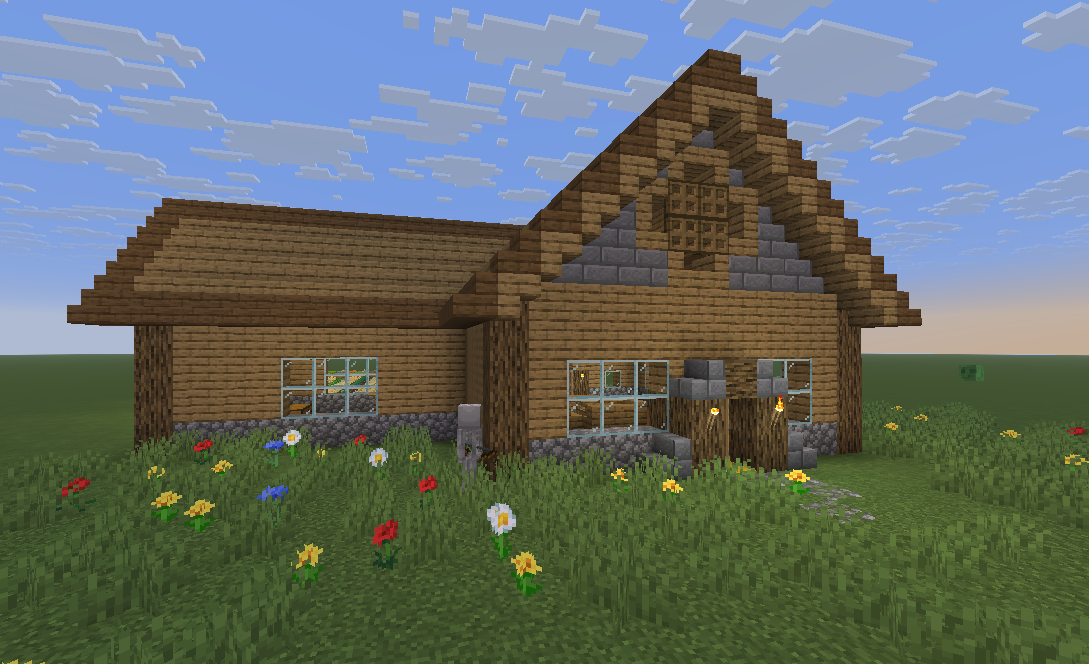 Cue a weeks-long timelapse of Steve completely transforming his hut into a proper house, and crop into a proper farm, but not before experimenting with the oak and spruce, cobblestone and deepslate, crafting table and furnace, which somehow leads to the discovery of smelting sand into glass, smelting cobblestone twice for a smooth texture, and molding pieces of cobbled deepslate for a smooth texture also. Ooh, he can make a pattern out of these, very kitchen-esque! And spruce makes a great floor and roof accent, it compliments the oak better than he's previously anticipated, oh, what about iron? Chains? Lanterns?? Oh yes please. Wool makes carpets? Well duh, it seems natural- and flowers make dye?!