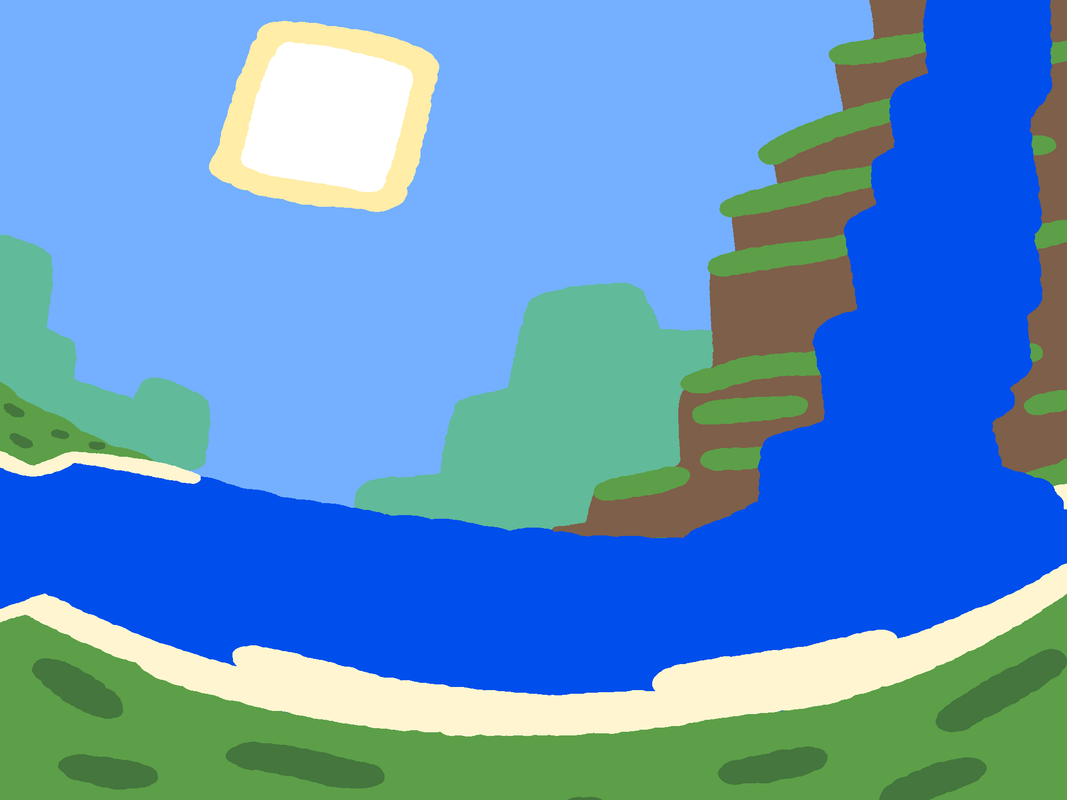 Come the next day, Steve and Dennis explore further into the plains, following the river Eastward (Steve's POV) until they reach a cliff with a waterfall, pouring into a big lake, the perfect spot for fishing, it seems. The man sits down by the slim, sandy shores and casts his fishing lure into the previously undisturbed, blue waters, watching the reflection ripple away into obscurity, only slightly.