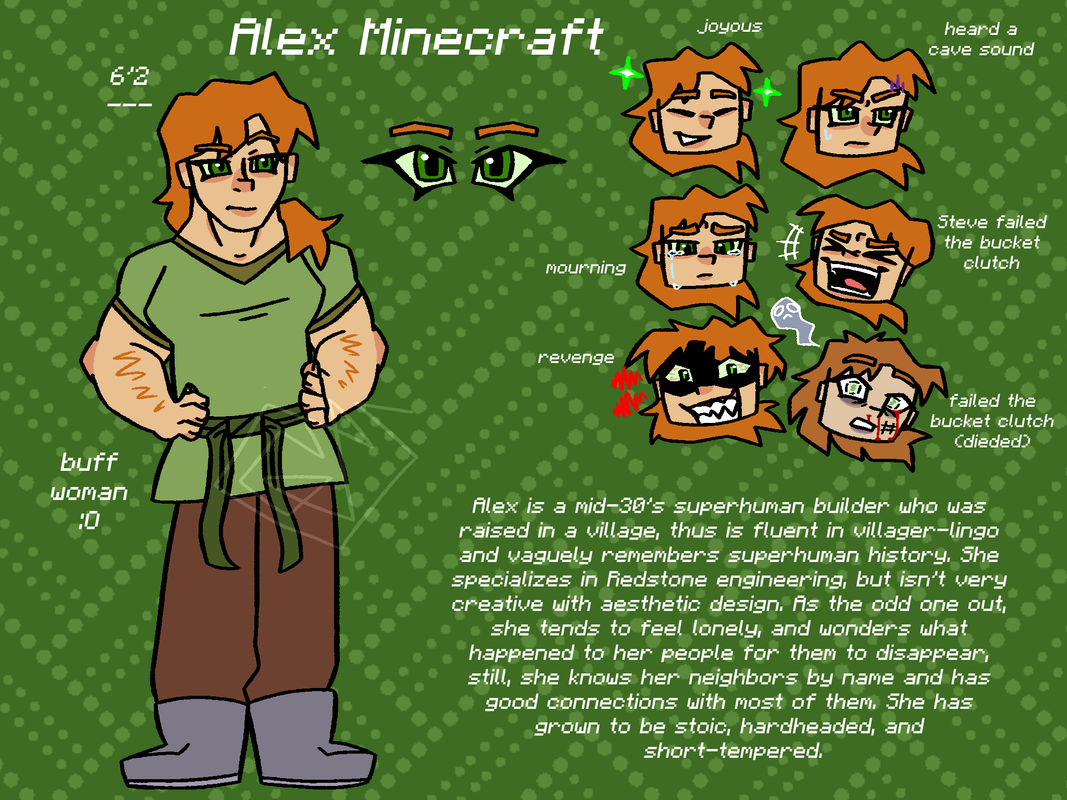 I know what the people want, and the people want a giant woman who can throw them like a trident and swing them around like a mace, and that is exactly what Alex Minecraft SHOULD BE! I'M RIGHT AND YOU KNOW IT!! AHAHAHAHAHAHAAA!!! *ahem* Anyway, the bobbleheads are more consistent now, since this was made some time after the Steve one, and they may look the same size here, but in the story she's got like 2 inches over him HEHEHEEE- This one was pretty fun once I got into it.