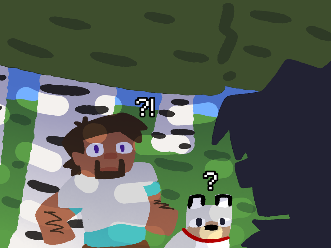 Steve perks up at the sound, looking around to find which direction it came from only to find a shadow move from the corner of his eye, and he turns to follow the shadow out of the spruce forest back into the oak, swerving past trees and jumping over elevated terrain until he reaches a wall. The shadow is revealed to be.. a grey wolf. Steve tilts his head, the wolf tilts its head, he steps closer, it steps closer, he reaches his hand out, and it gives it a sniff.. before suddenly scurrying off.