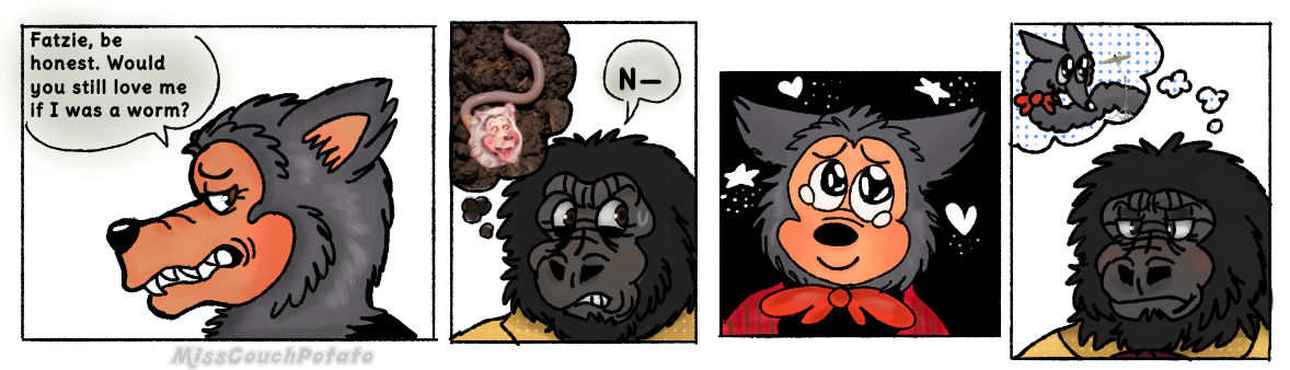 Fatz chuckled over Rolfe's singing as the wolf continued. “Oh, come on…” The gorilla huffed.