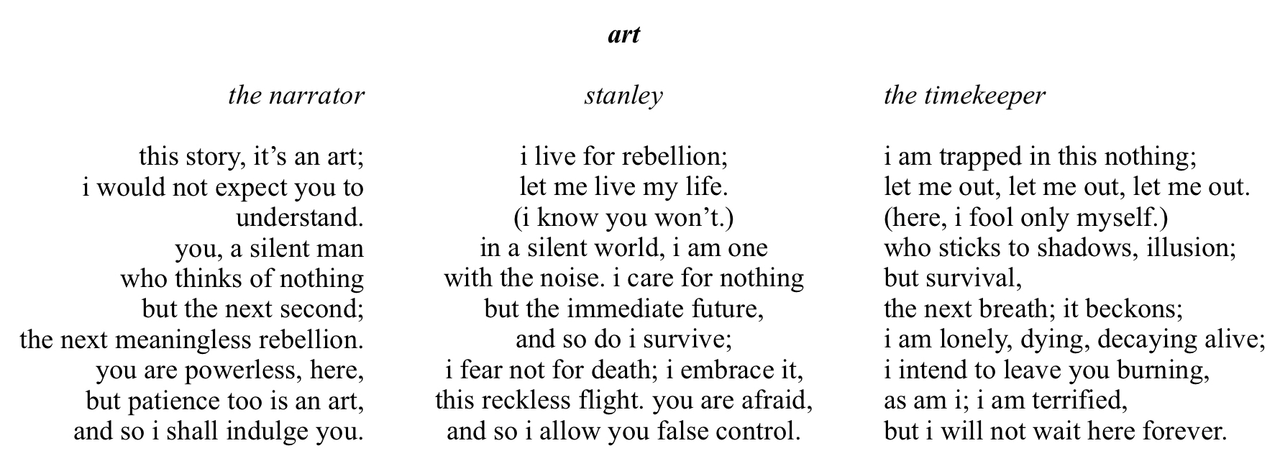 This must be the thousandth time in a row that they’ve done this exact same ending, changing what they do only very slightly from loop to loop. The Narrator has been getting annoyed at them more often lately—they’re sure he must think they’re insane by now, and he’s probably right, but they don’t care. It doesn’t matter. They don’t have anything anymore. Their voice is gone. Their rat is gone. Tilly. Their only friend in the entire Parable, the singular good thing in their life. They’d cried for so long that the Narrator had taken that away, too. They can’t cry anymore. They can’t anything. They just need to get out.