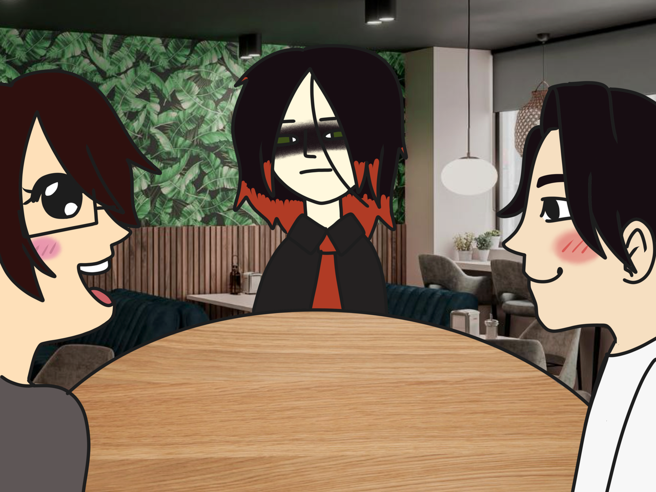 Menos mal que no se me ensuciaron las botas. Cuando intenté levantarme me volví a caer justo delante de mi compañero de mesa. Que vergüenza. Miré hacia el chico que tenía a mi lado. Tenía el pelo negro con las puntas teñidas de rojo. Tenía un maquillaje negro alrededor de los ojos. Parecía un mapache. Llevaba el uniforme de color negro. No sabía que se podía conseguir en ese color, resalta mucho la corbata roja que llevaba.
