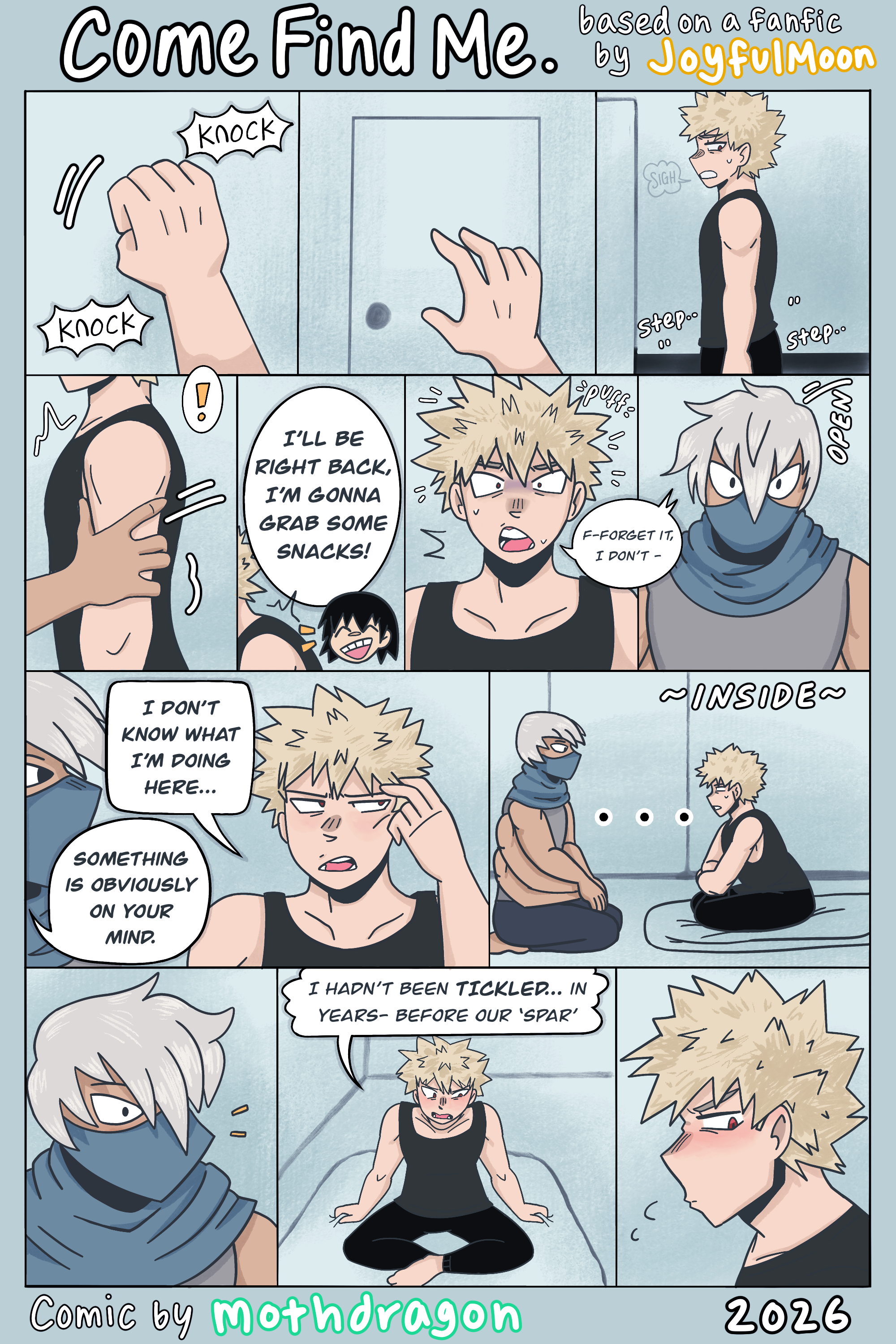 Katsuki sucked in a breath, letting his head fall back against his door. Come find me. So far, the multi-armed teen had kept his word and not told anyone about their ‘spar’... did that mean he was being honest about this, too?