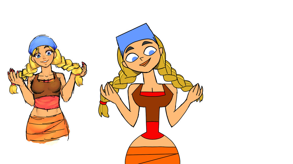 "Welcome back to Total Drama Island. All right, its time we meet our 11 first campers." Chris said before turning to address to the camera. "We told them that they were staying in a 5 star resort, so if they seems a little mad thats probably why." The host said smirking. Seeing the first boat arrive, Chris sees getting out a girl with a chestnut hair in a side pony tail, a long green shirt that was tied on the side, along with tight pink pants and white shoes, also wearing braces and glasses.