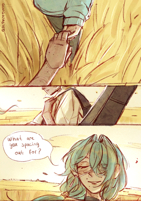 In the sea of sparkling yellows and gold, the wheat which lazily swayed in the cooling breeze bowed to the side as Phainon let himself be guided towards a tree with leaves of molten gold. Under the shades, a blanket was carefully set down and a picnic basket sat by its side.