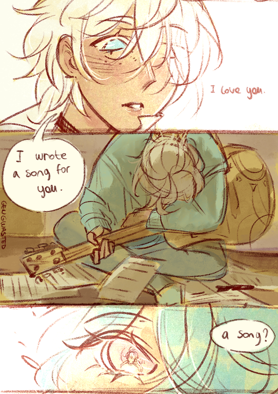 He floundered--his stomach in his throat--for just a moment, until he clumsily slid into the spot next to Anaxa.The clasp of his guitar case was an unsolvable puzzle, pried open with trembling hands and a shaky breath. The instrument was as heavy as a boulder, his fingers sliding from the taut strings from the sweat of his nervousness.