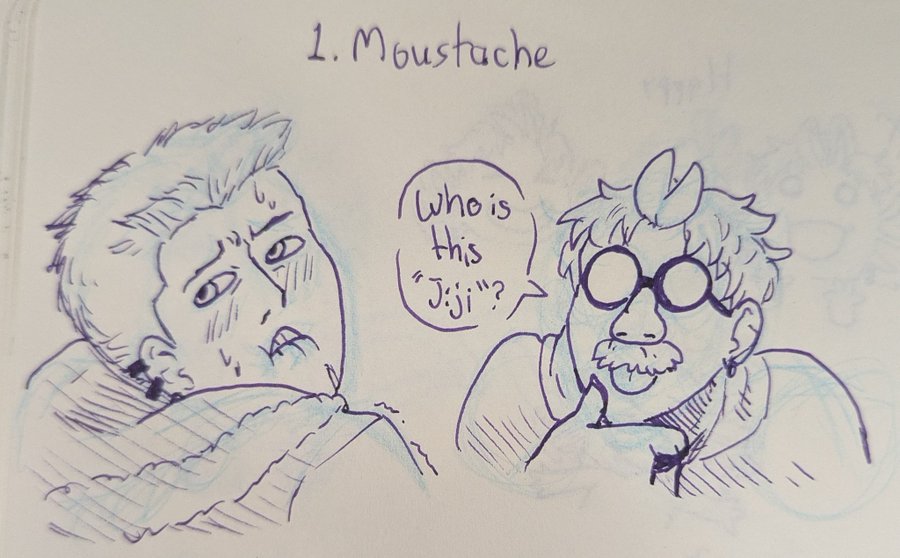 "This 'Jiji' boy sounds like a total cyutie," he went on, reaching forward and resting his chin on his boyfriends shoulder. "I mustache you if he's a total keeper."