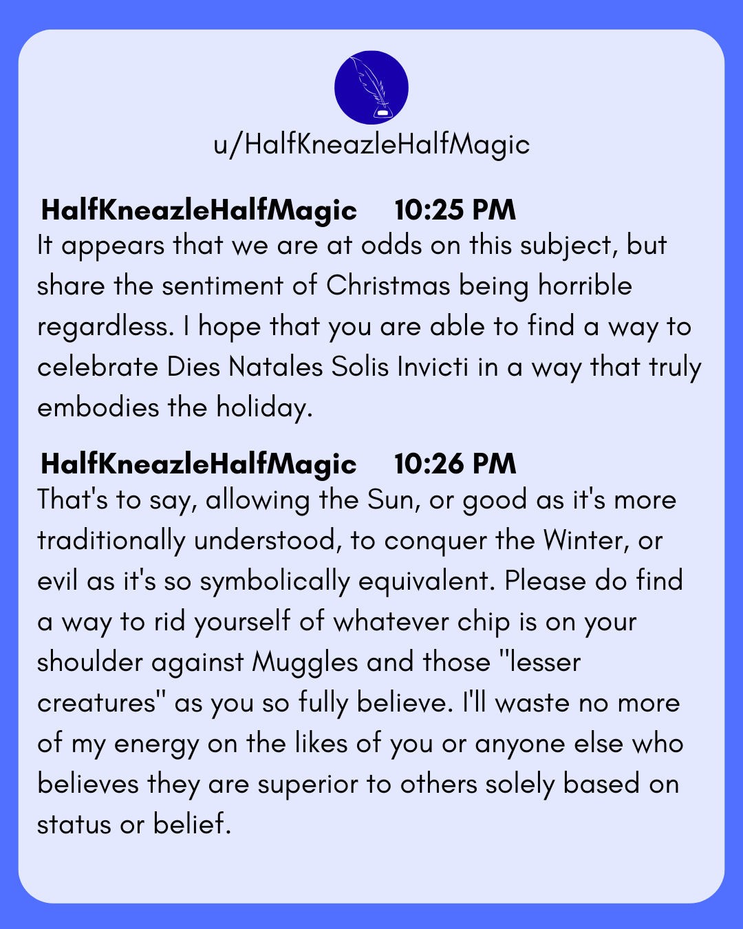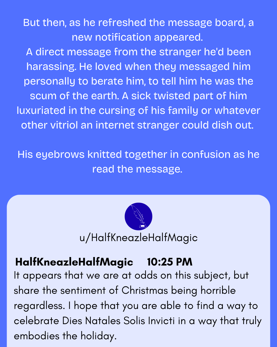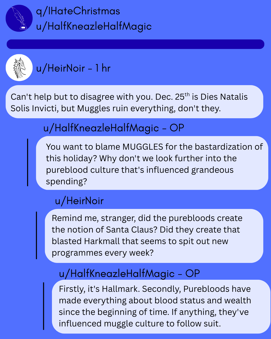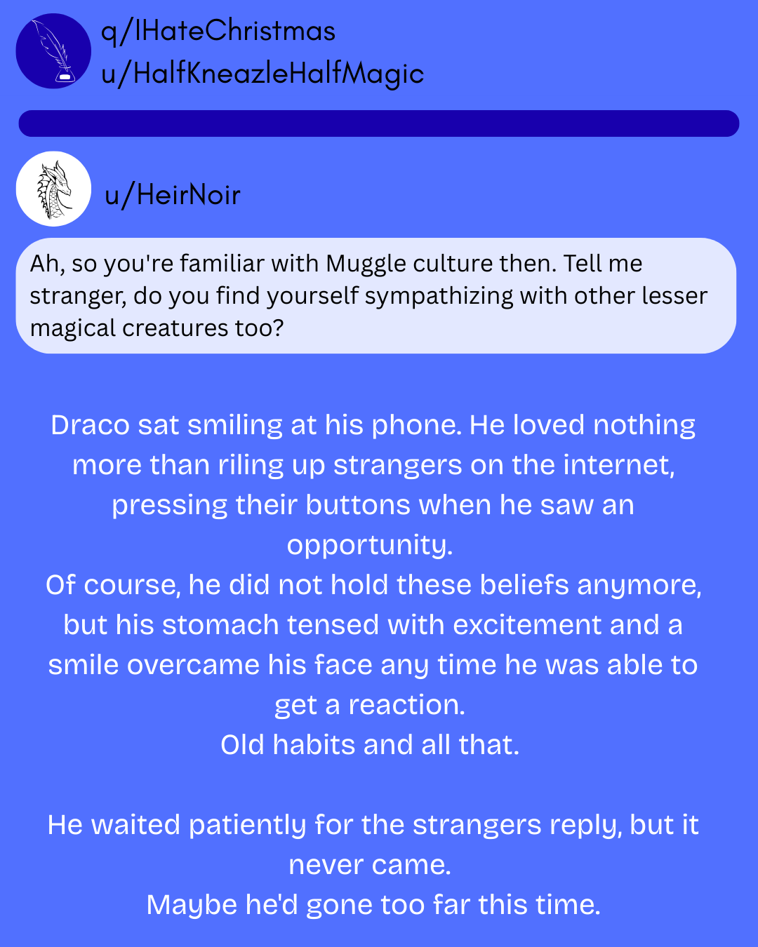 Draco used Quillit for a different reason. He'd grown numb to the anger that he'd faced after the war, and was only able to find new thrills through rage baiting people online. The perfect opportunity presented itself during the week leading up to Christmas.