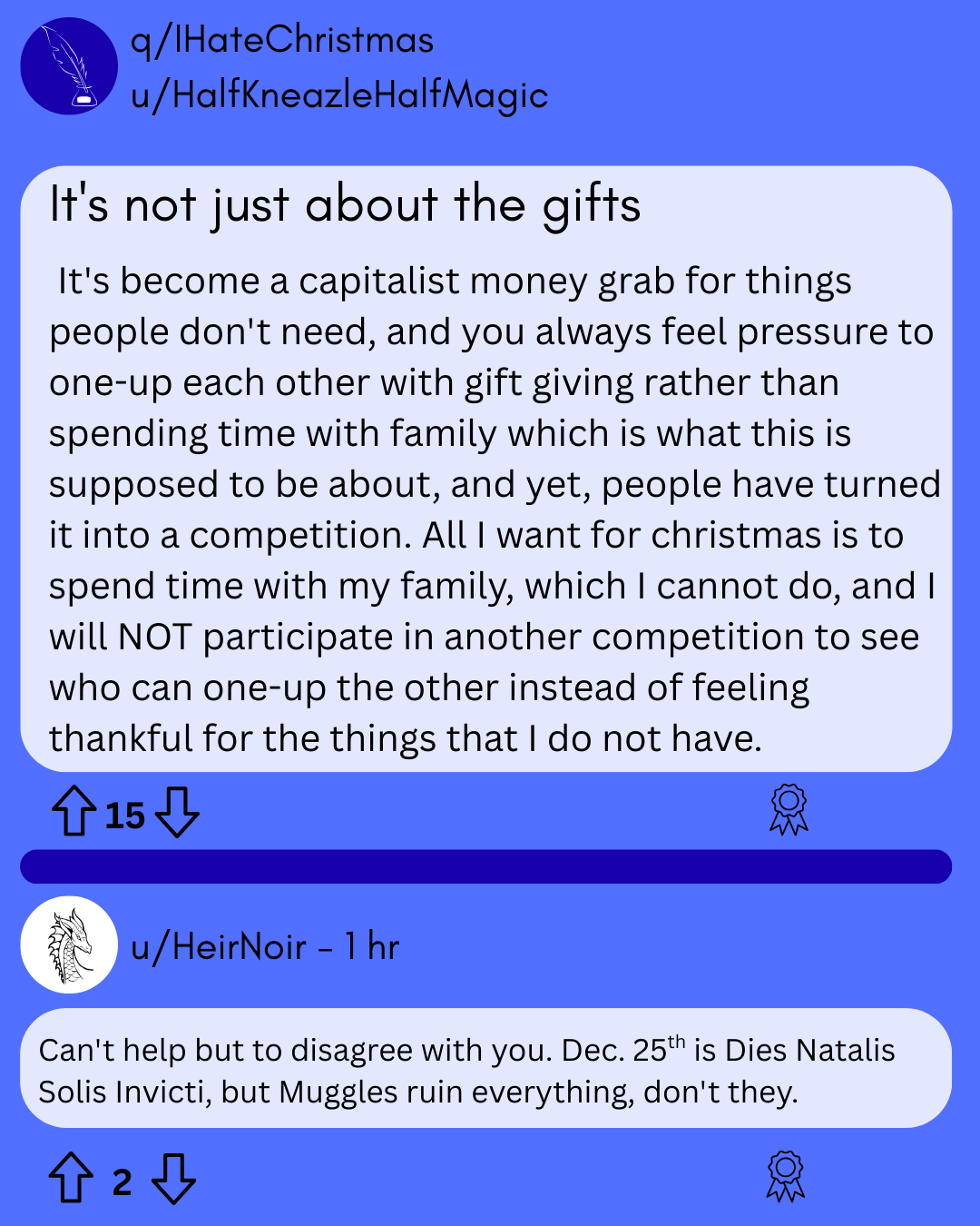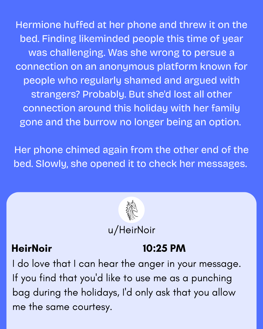 Hermione had found solace in the anonymity of Quillit, the Magical anonymous message board, after her split with Ron. She didn't have as many people to lean on in her every day life. Harry and Ginny had become parents and weren't as available to listen to her grievances, nor did they want to hear about her hatred of their most favorite holiday.
