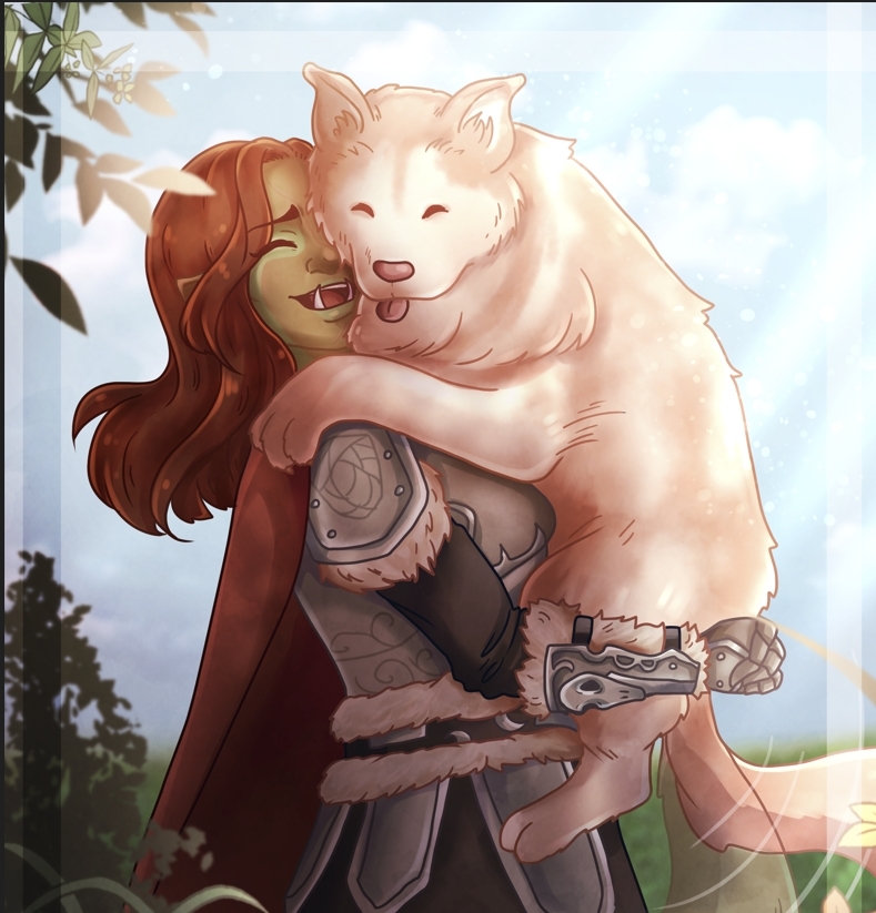 Suddenly, Uskerva remembered to breathe and scrambled to scoop up the little pup in her arms. The oft-formidable Orc now trembled like a scared babe as she stared at the dog resting calmly in her arms. He began to lick at the dried blood stained on her Wolf armor.