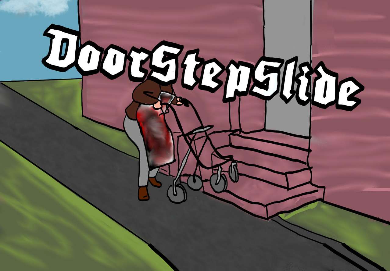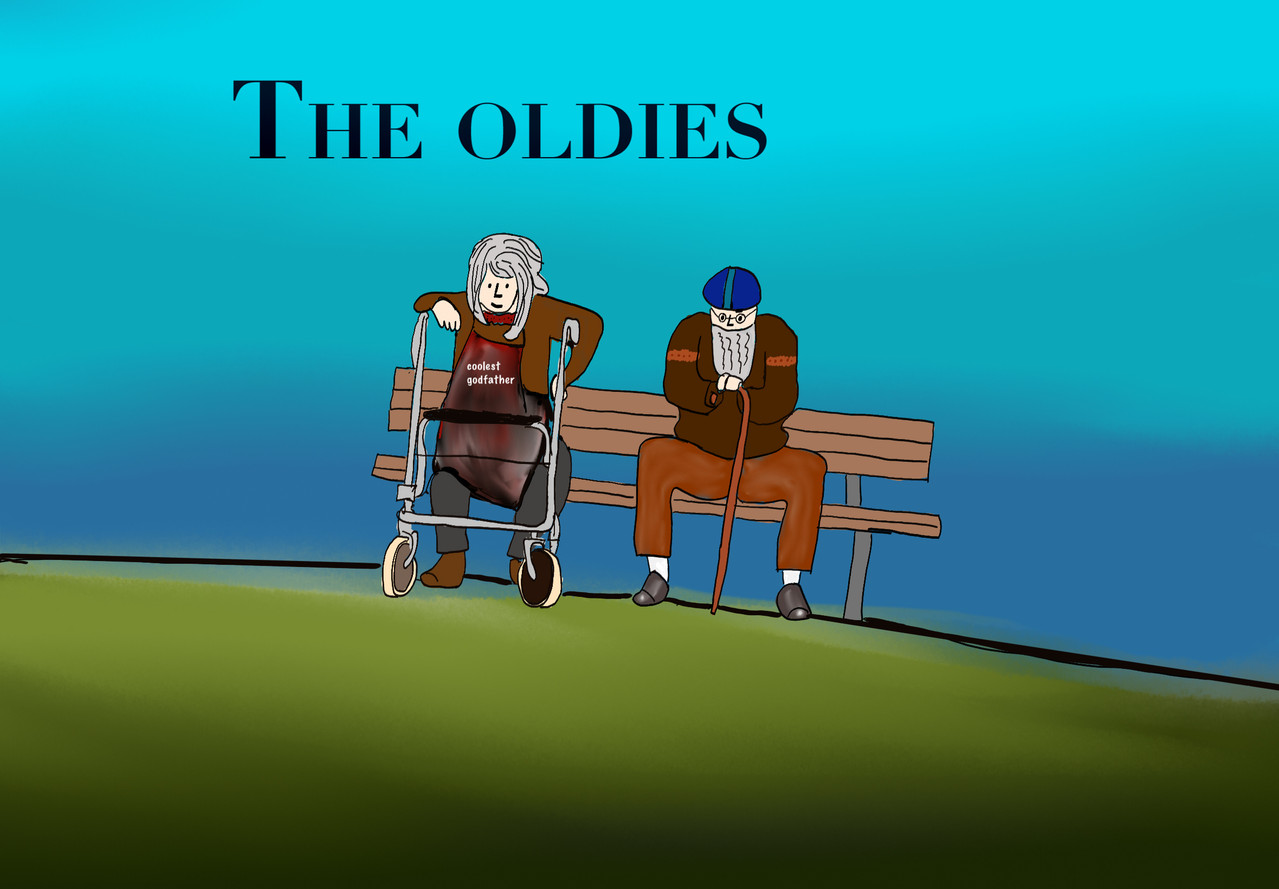 Beside him is Remus with a blue cap, glasses and a dark brown jumper and lighter bown pants. He is holding a walking stock. Both are looking at the viewer. Above them is a text reading: The oldies2. picture: In the background is a blue shy, with green gras, in the front in a red house with steps. On the step is Sirius weaing the same outfit as before. He is holding the rollator the forst two wheels going over the step, he is doing a trick. His head is hidden by a Big text that reads: DoorstepSlide