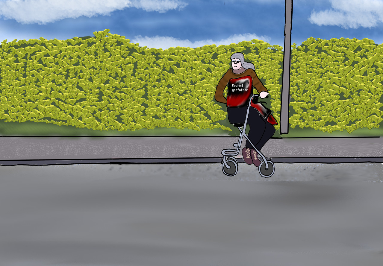 1. picture: We see Sirius and Remus siting on a bench. They are surounded by a blue sky and green grass. The bench is a light brown. Sirius is leaning on a rollator/ walker. Which s grey and black. Sirius has grey hair. he wears a brwon jumper, drak grey pants and a red, white over shirt that reads: coolest godfather.