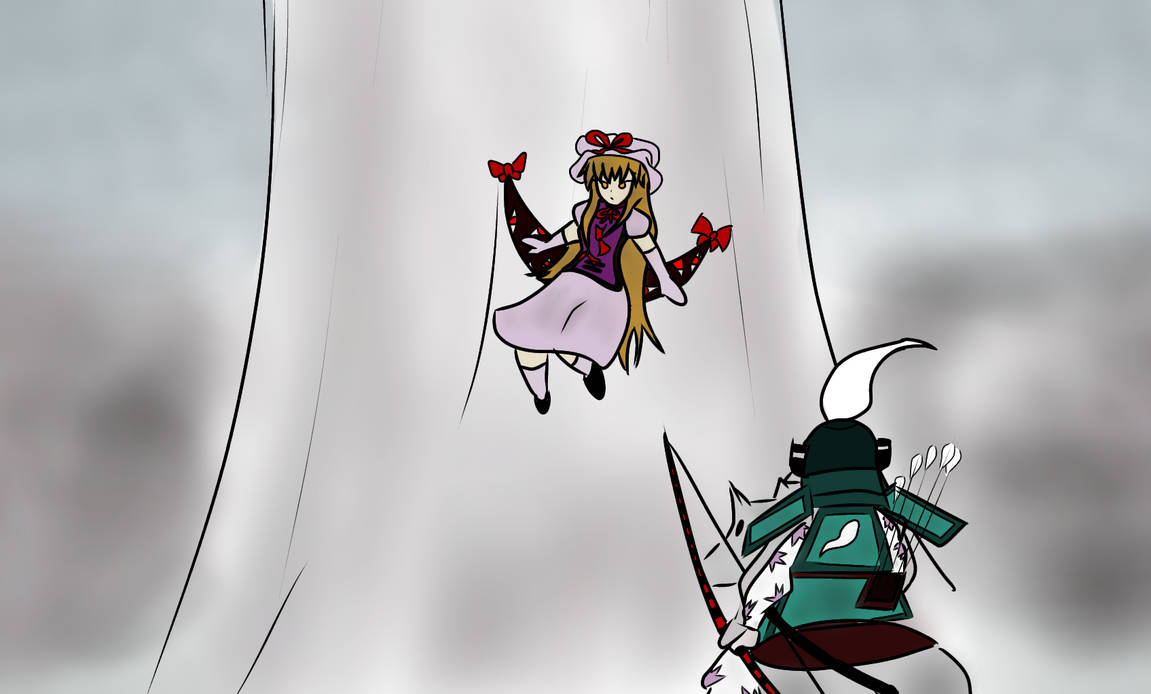 Through her senses alone, Youmu sensed a danger emanating from the phantom's instrument and immediately nocked an arrow from her quiver, sending the shaft through the air with its tip aimed not at the phantom but at the sky itself.