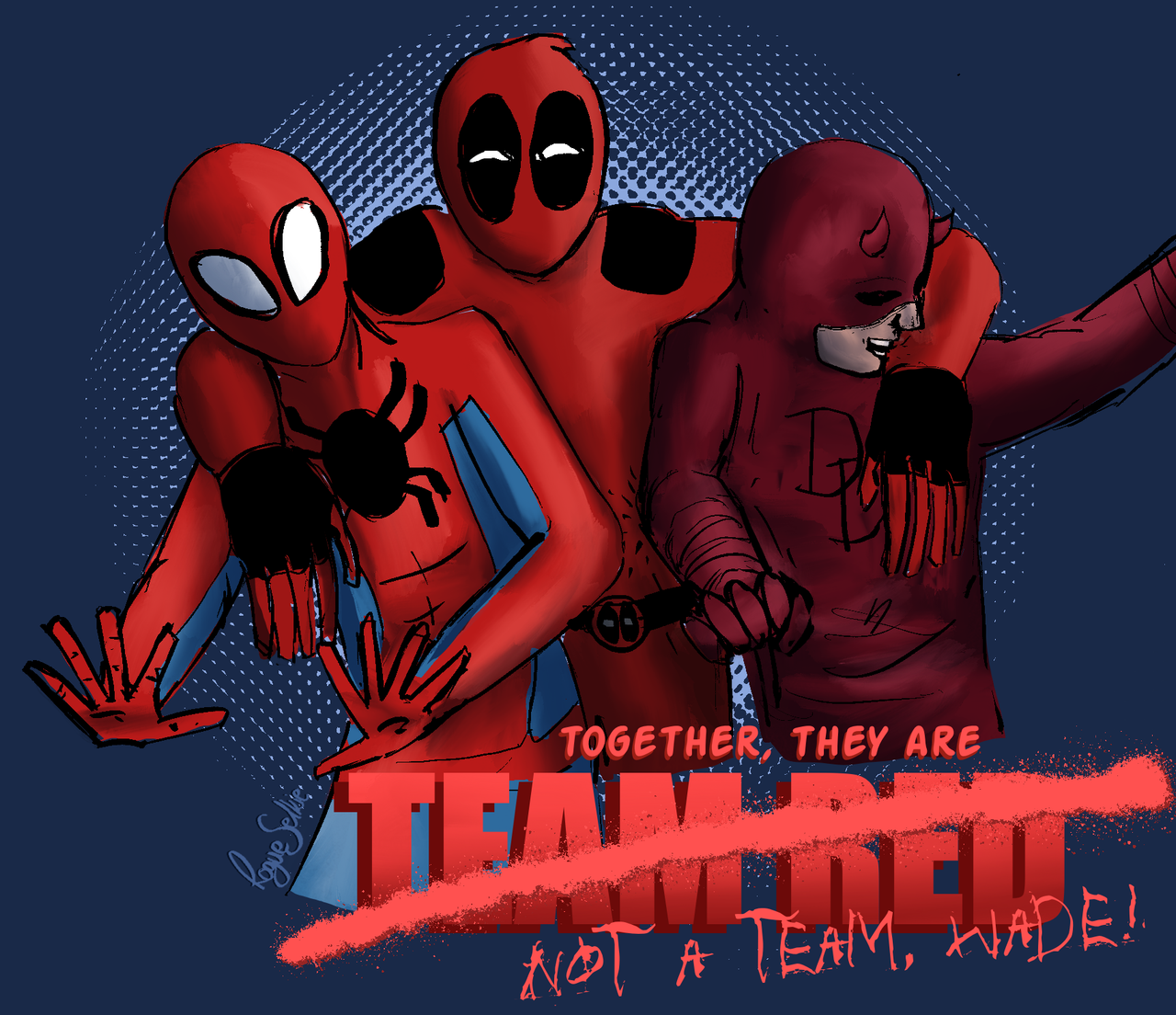 Image description: Team Red, where Deadpool is the only one happy to be there.