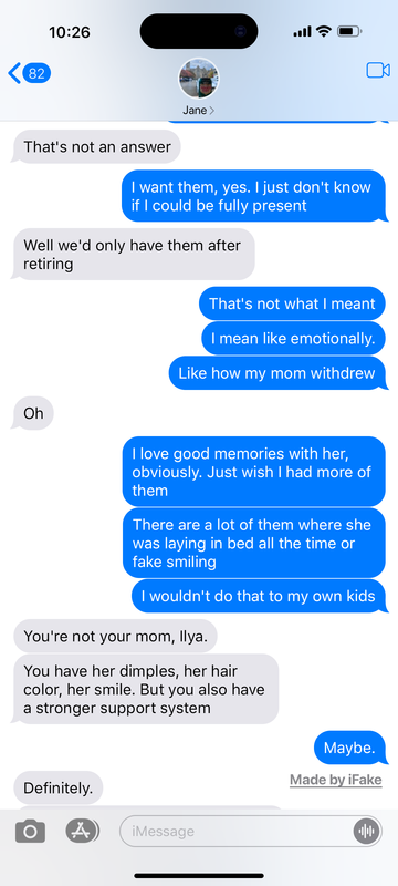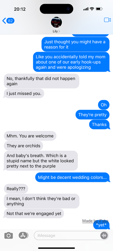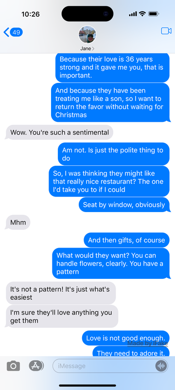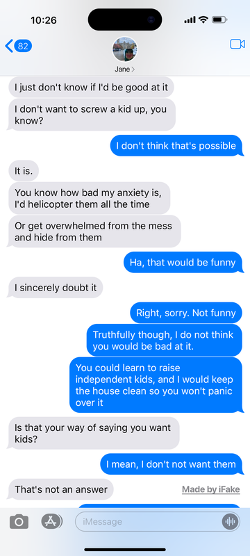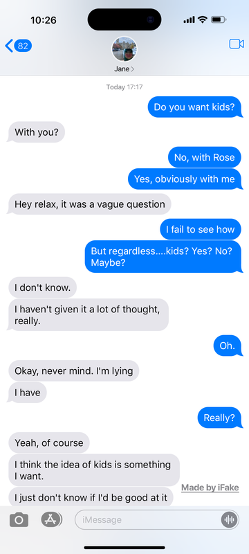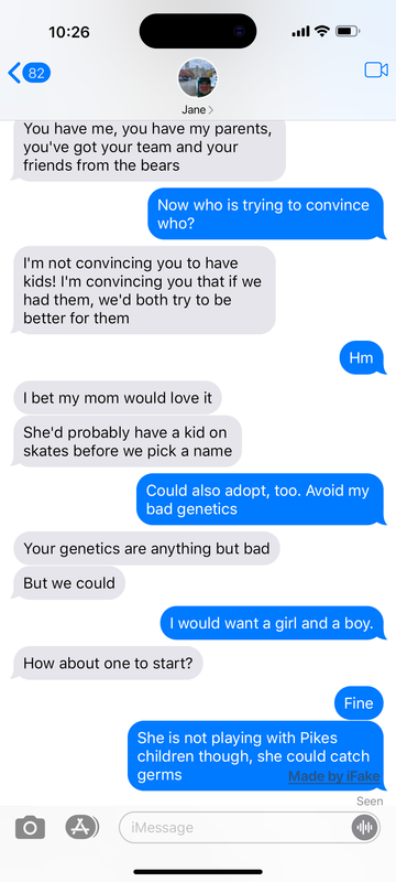 Unable to look at it, anymore, he scrolled. Past messages about more little gifts and complaints about being lonely or missing each other, intent on just getting to the end of them. Instead, his eye caught on the word ‘kid’ and he froze, scrolling back up immediately.