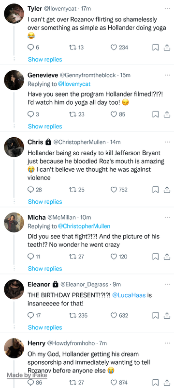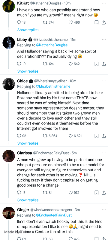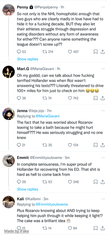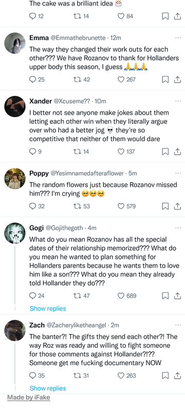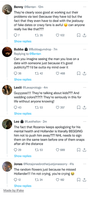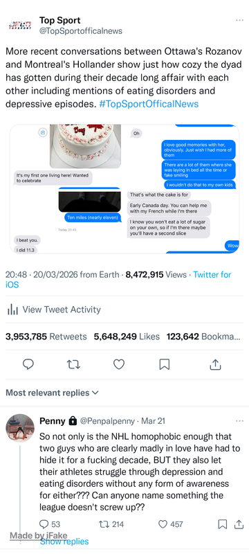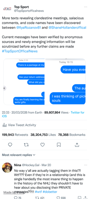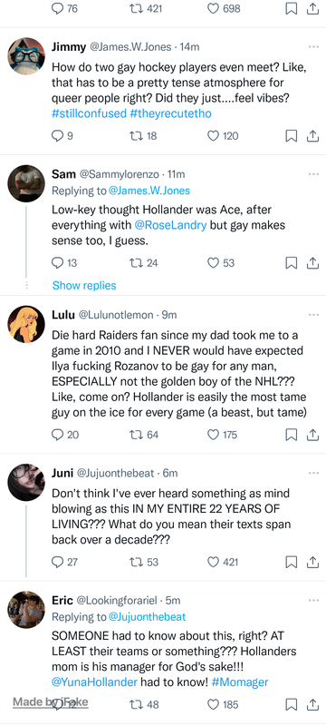 His eyes flitted up, then back down, looking like he was having a full epiphany of some sort. “It- Top Sports twitter account,” was all he could manage to spit out, making a rather rushed gesture with his hand like he needed the others to also check their phone this very instant. “Hollander and Rozanov.”