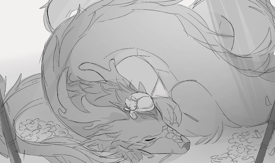 «My Shizun told me that since I possess the spirit of a great beast, my best option was to get used to this state… I almost ran into your Shizun’s bamboo hut on my way here… Besides, they say dragons possess wisdom! Don’t you think it’s interesting that I’ve become one? There hasn’t been one in the sect for two centuries!» Shi Qiang’s voice sounded again, and Shen Jiu lowered his guard and sheathed his sword. He approached where the head was resting in the grass and crouched slightly to stroke its snout.