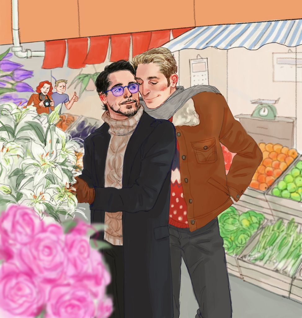 Tony and Steve are having a date at the market. Nat and Clint have (secretely) set themselves the task of taking as many sappy photos as they possibly can and making sure nobody, neither an overeager Captain America fan nor a certain Dr. Doom, would interrupt the couple in their soulful intense gazing into each other's eyes.