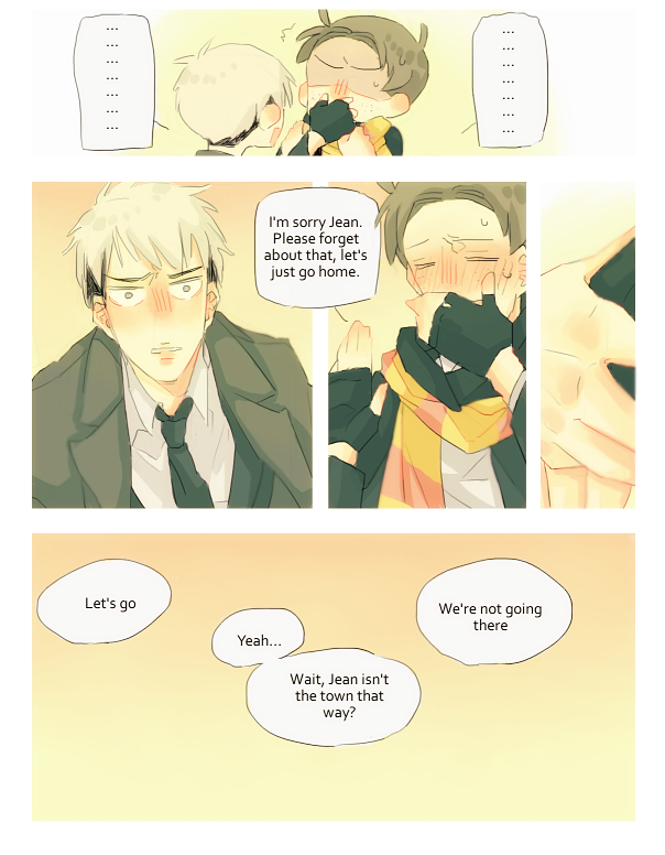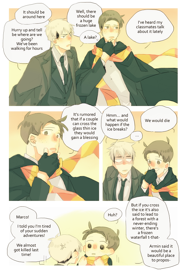 I love Harry Potter AUs yet I don't really know anything about the universe haha. I tried combining the two prompts which were AU with squib!Jean and wizard or muggle!Marco and second prompt of them being thrown into a deserted island or huddling up together in fear some other way. I feel like it isn't really either, my comics always end up so cheesy, I'm sorry. Happy holidays! (´m`;)